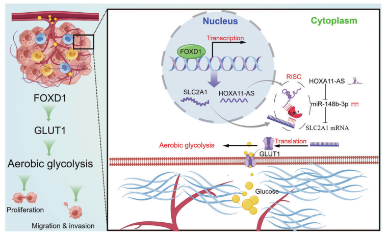另外,在机制实验中,研究者证明了,FOXD1不仅可以直接促进SLC2A1的转录,而且可以通过RNA诱导的沉默复合体抑制SLC2A1的降解。